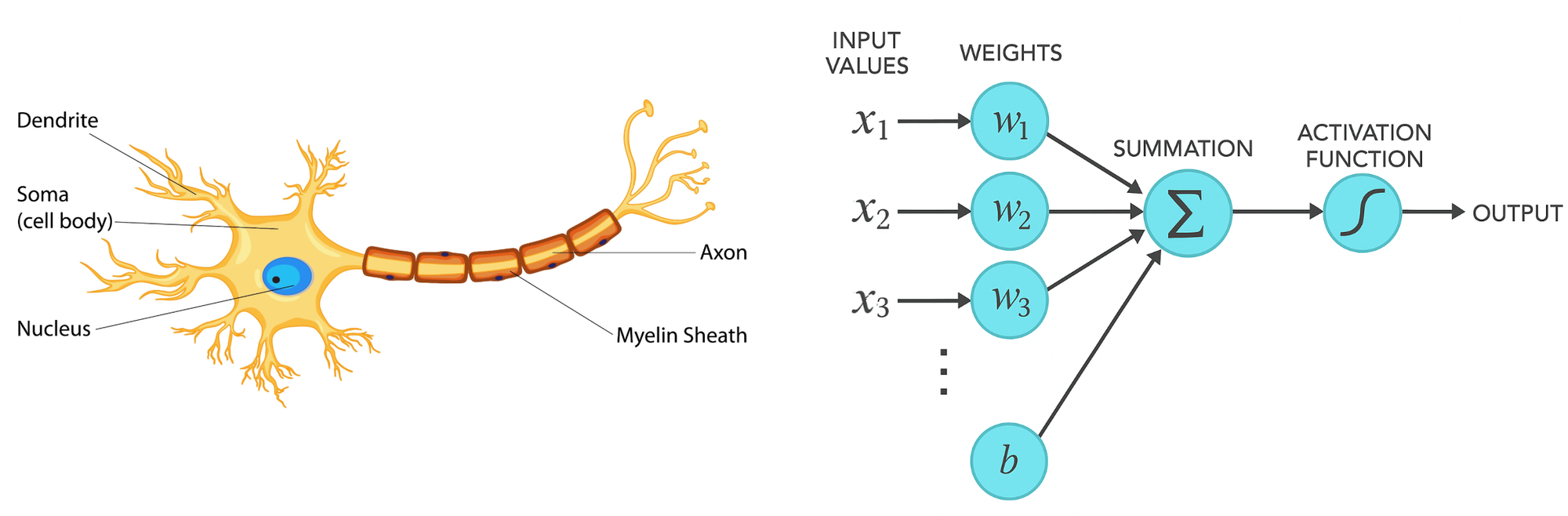 - Cell Body → Weighted Sum: We combine all the inputs by multiplying them with their weights and adding them together.